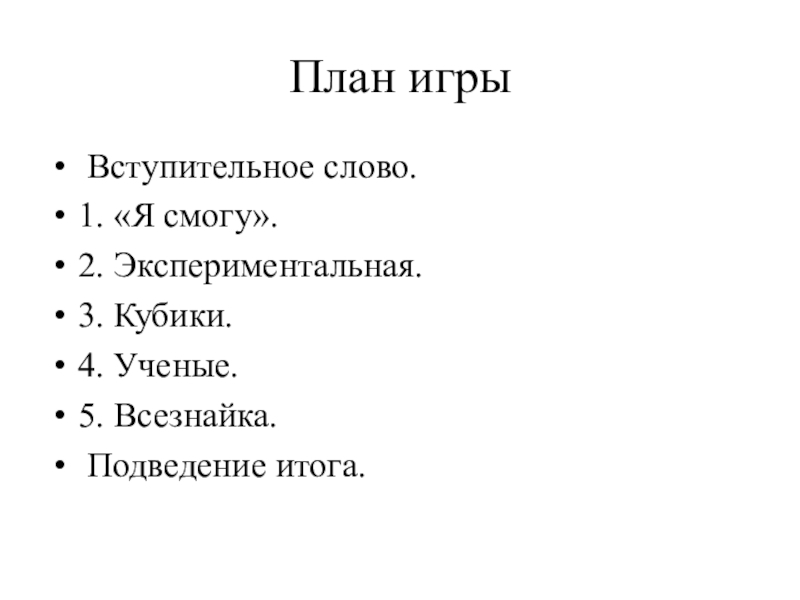 План игры Вступительное слово.1. «Я смогу».2. Экспериментальная.3. Кубики.4. Ученые.5. Всезнайка. Подведение итога.