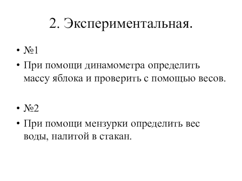 2. Экспериментальная.№1 При помощи динамометра определить массу яблока и проверить с помощью весов.№2При помощи мензурки определить вес