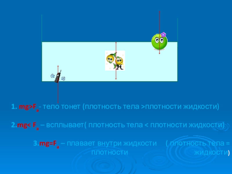 1. mg>Fa- тело тонет (плотность тела >плотности жидкости) 2.mg< Fa – всплывает( плотность тела < плотности