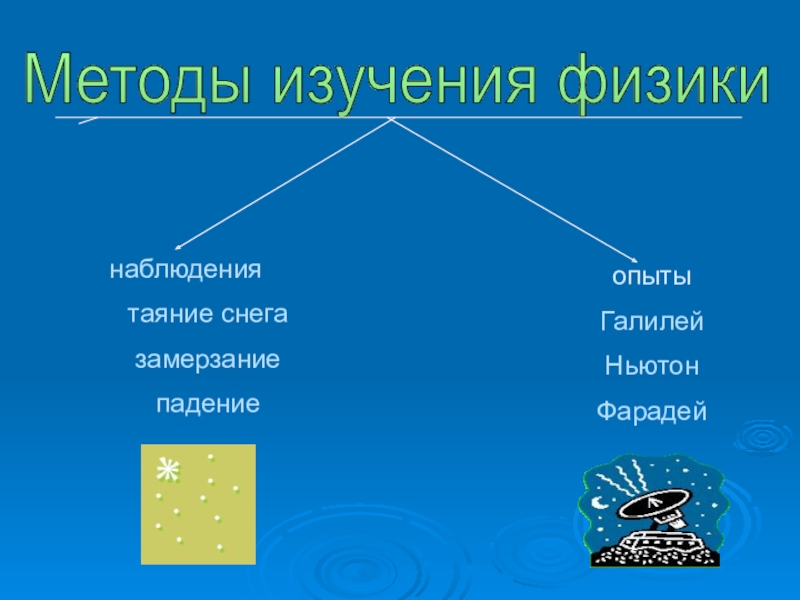 Методы изучения физики наблюдениятаяние снегазамерзание падениеопытыГалилейНьютонФарадей