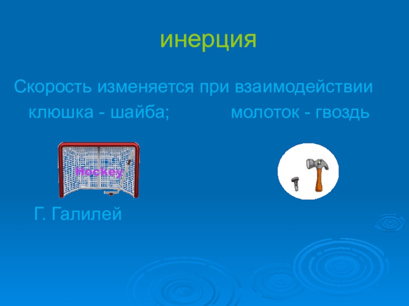 инерцияСкорость изменяется при взаимодействии  клюшка - шайба;      молоток - гвоздь