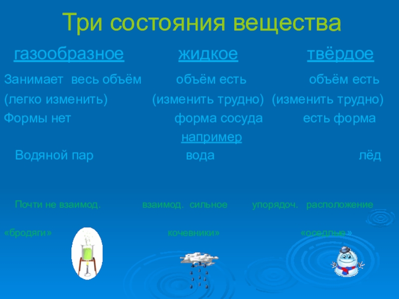 Три состояния вещества газообразное      жидкое       твёрдое