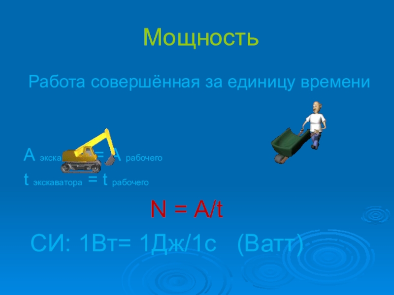 Мощность Работа совершённая за единицу времениА экскаватора = А рабочегоt экскаватора = t рабочего