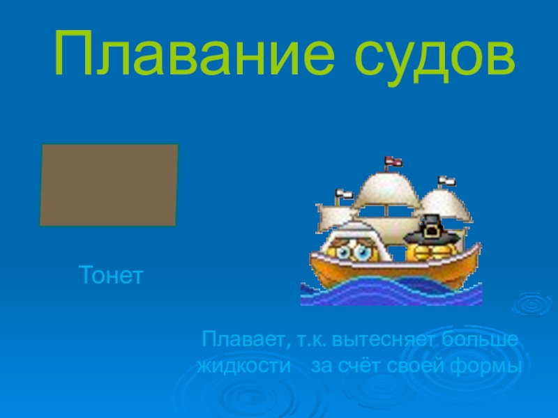Плавание судов   Тонет Плавает, т.к. вытесняет больше жидкости  за счёт своей формы