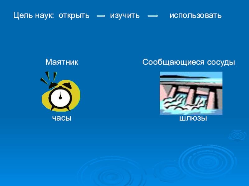 Цель наук: открыть     изучить       использоватьМаятникчасыСообщающиеся сосуды