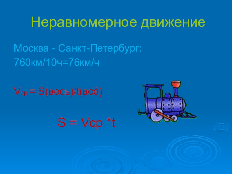 Неравномерное движениеМосква - Санкт-Петербург: 760км/10ч=76км/чVср = S(весь)/t(всё)      S = Vср *t