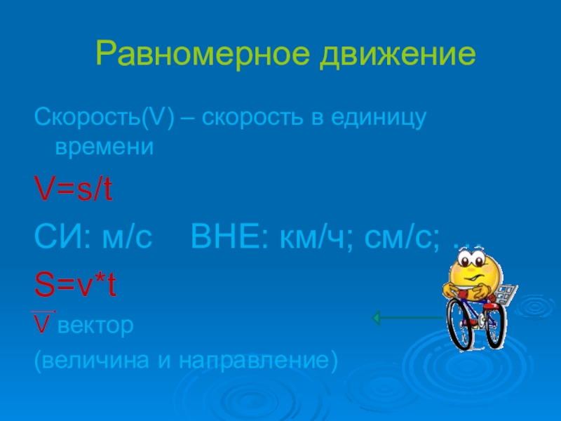 Равномерное движениеСкорость(V) – скорость в единицу времениV=s/tСИ: м/с  ВНЕ: км/ч; см/с; …S=v*tV вектор(величина и направление)