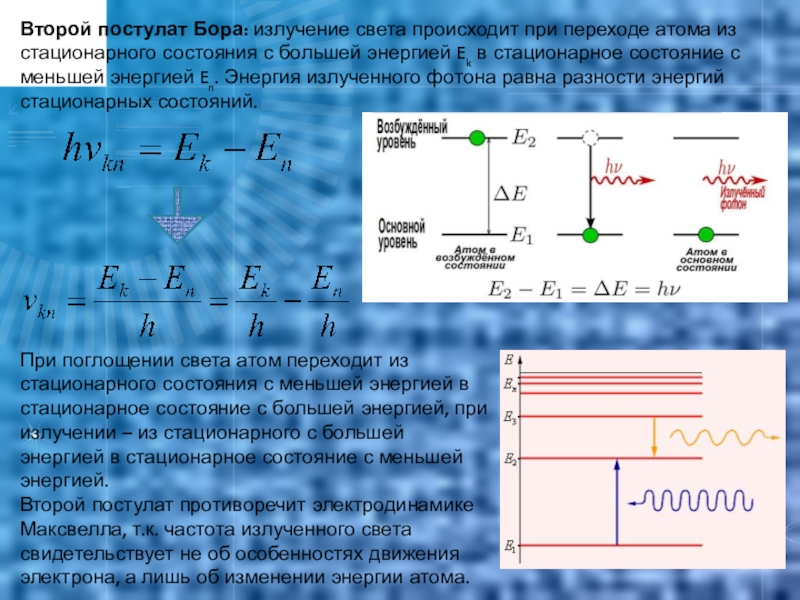 Второй постулат противоречит электродинамике Максвелла, т.к. частота излученного света свидетельствует не об особенностях движения электрона, а лишь об изменении энергии атома.