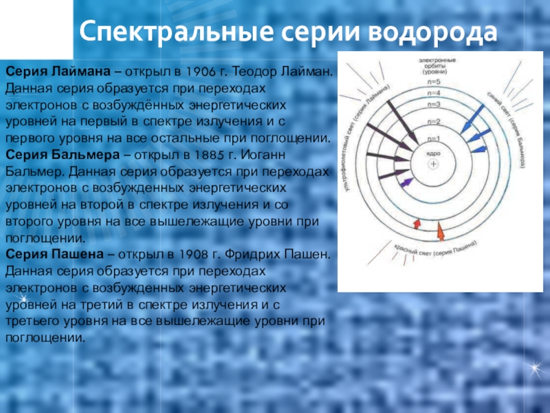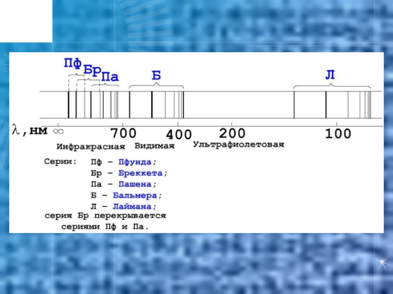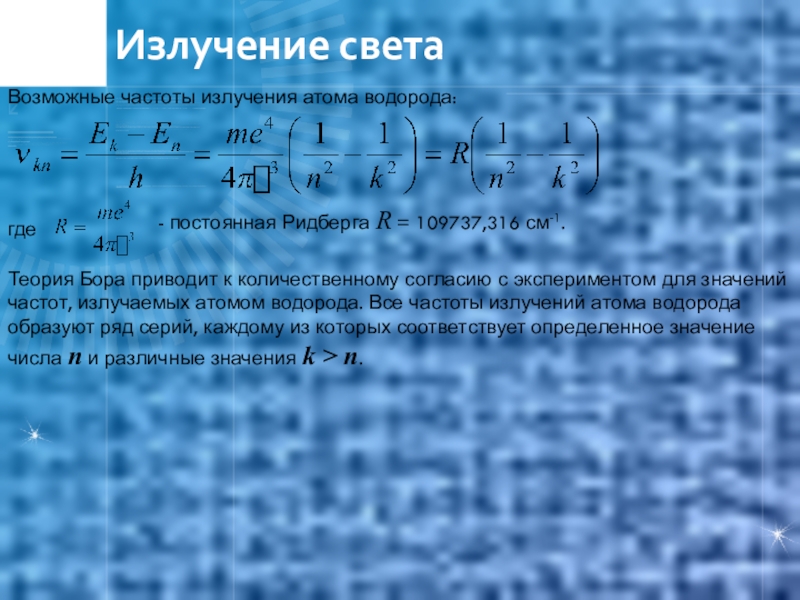 Теория Бора приводит к количественному согласию с экспериментом для значений частот, излучаемых атомом водорода. Все частоты излучений атома водорода образуют ряд серий, каждому из которых соответствует определенное значение числа n и различные значения k > n.