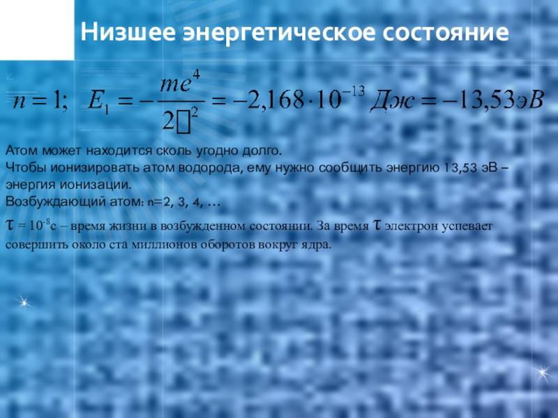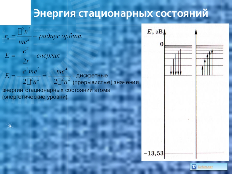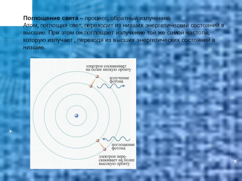 При поглощении света атом переходит из стационарного состояния с меньшей энергией в стационарное состояние с большей энергией, при излучении – из стационарного с большей энергией в стационарное состояние с меньшей энергией.