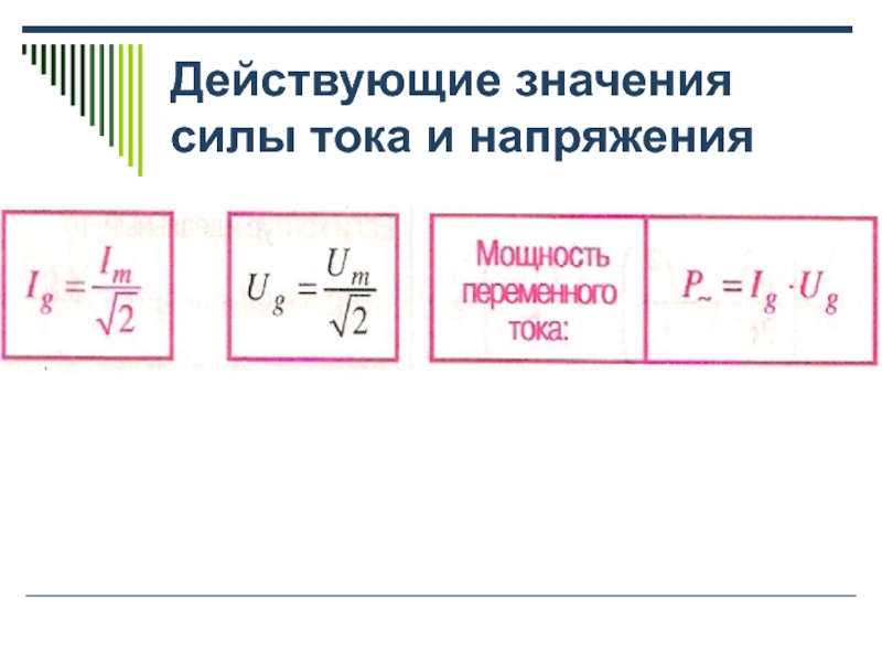 Слайд 14Действующие значения силы тока и напряжения