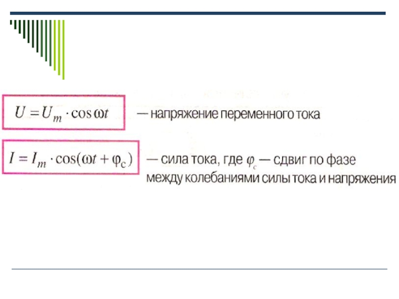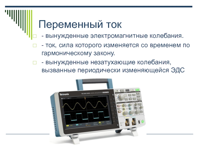 Переменный ток- вынужденные электромагнитные колебания.- ток, сила которого изменяется со временем по гармоническому закону.- вынужденные незатухающие колебания,