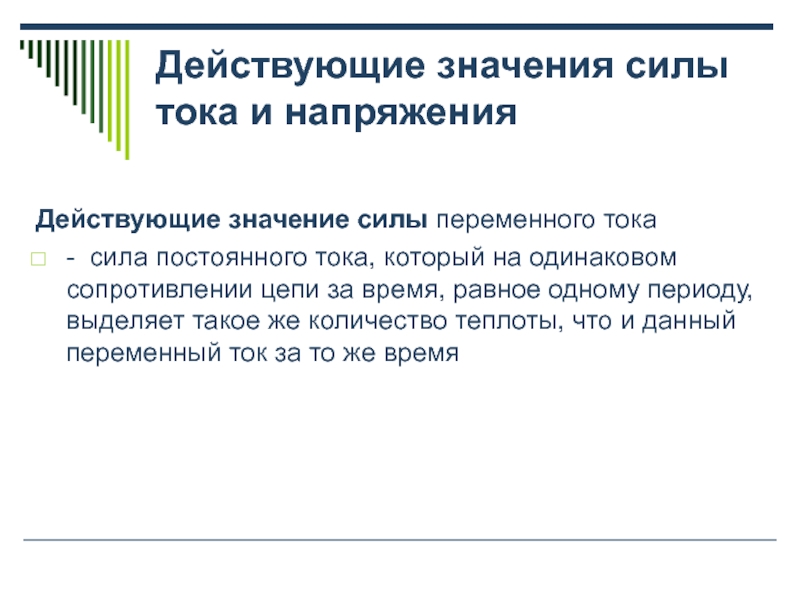 сила постоянного тока, который на одинаковом сопротивлении цепи за время, равное одному периоду, выделяет такое же количество теплоты, что и данный переменный ток за то же время