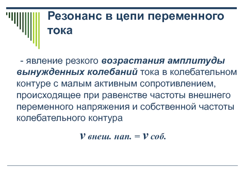 Резонанс в цепи переменного токаРезонанс наблюдается в том случае, когда собственная частота колебаний системы совпадает с частотой