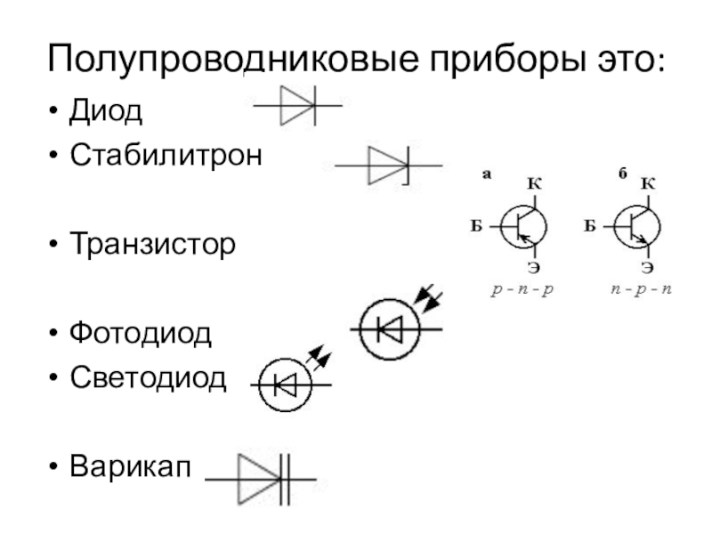 Полупроводниковые приборы это:Диод Стабилитрон Транзистор Фотодиод Светодиод Варикап
