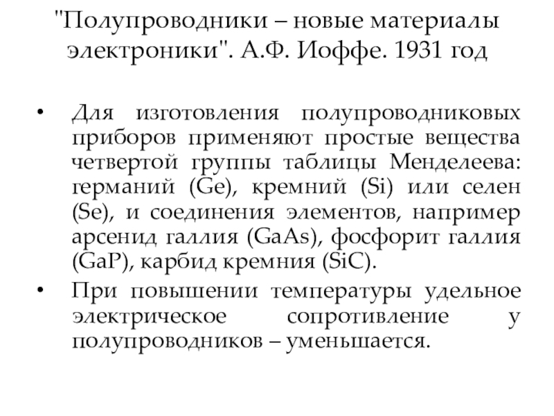 "Полупроводники – новые материалы электроники". А.Ф. Иоффе. 1931 год Для изготовления полупроводниковых приборов применяют простые вещества четвертой группы таблицы Менделеева: германий (Ge), кремний (Si) или селен (Se), и соединения элементов, например арсенид галлия (GaAs), фосфорит галлия