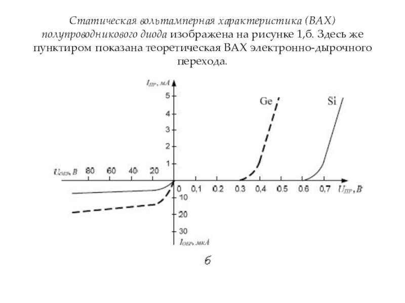 Слайд 6Статическая вольтамперная характеристика (ВАХ) полупроводникового диода изображена на рисунке 1,б. Здесь