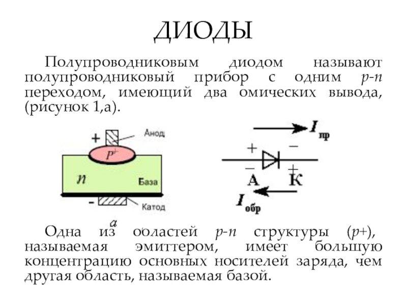 ДИОДЫ 	Полупроводниковым диодом называют полупроводниковый прибор с одним р-n переходом, имеющий два омических вывода, (рисунок 1,а). 	Одна