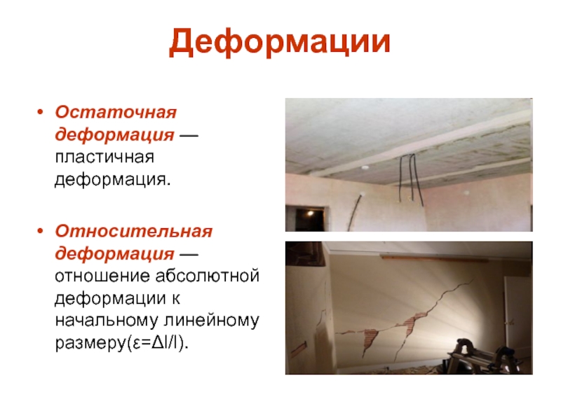 ДеформацииОстаточная деформация — пластичная деформация.Относительная деформация — отношение абсолютной деформации к начальному линейному размеру(ε=Δl/l).