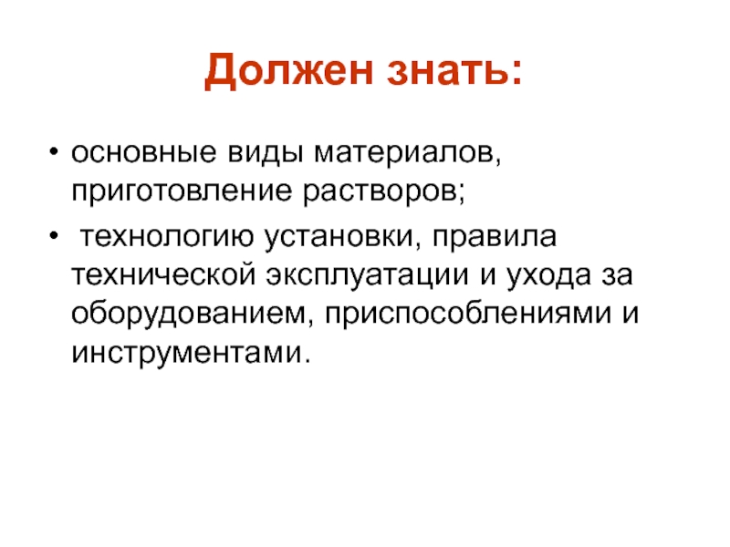 Должен знать:основные виды материалов, приготовление растворов; технологию установки, правила технической эксплуатации и ухода за оборудованием, приспособлениями и инструментами.