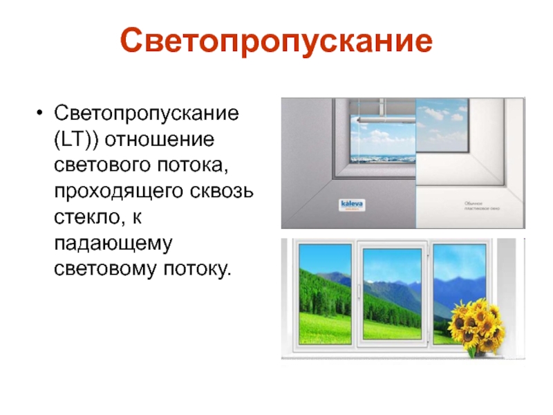 Светопропускание Светопропускание (LT)) отношение светового потока, проходящего сквозь стекло, к падающему световому потоку.