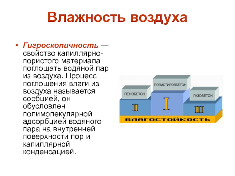 Влажность воздухаГигроскопичность — свойство капиллярно-пористого материала поглощать водяной пар из воздуха. Процесс поглощения влаги из воздуха называется