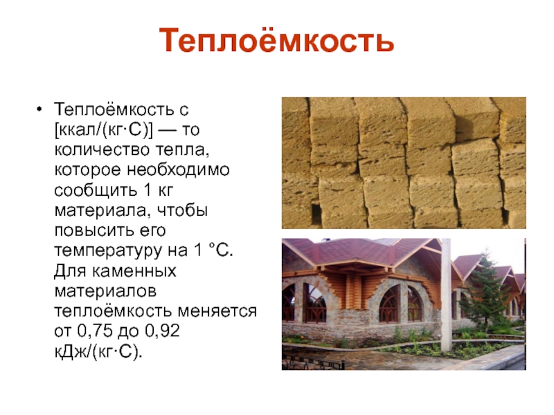 1 кг материала, чтобы повысить его температуру на 1 °C. Для каменных материалов теплоёмкость меняется от 0,75 до 0,92 кДж/(кг·С).