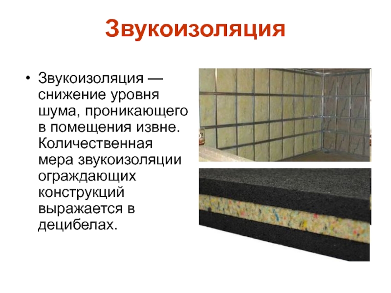 Звукоизоляция — снижение уровня шума, проникающего в помещения извне. Количественная мера