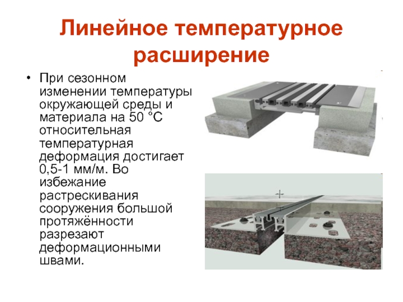 50 °C относительная температурная деформация достигает 0,5-1 мм/м. Во избежание растрескивания сооружения большой протяжённости разрезают деформационными швами.
