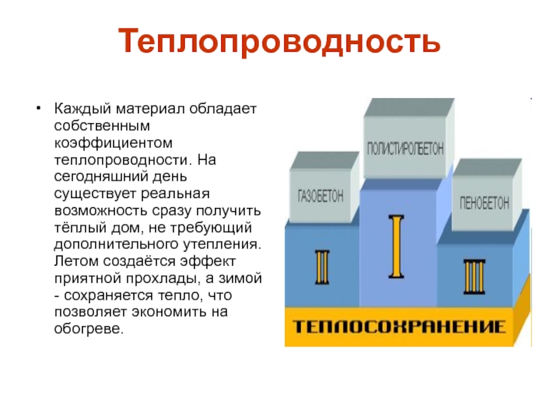 ТеплопроводностьКаждый материал обладает собственным коэффициентом теплопроводности. На сегодняшний день существует реальная возможность сразу получить тёплый дом, не