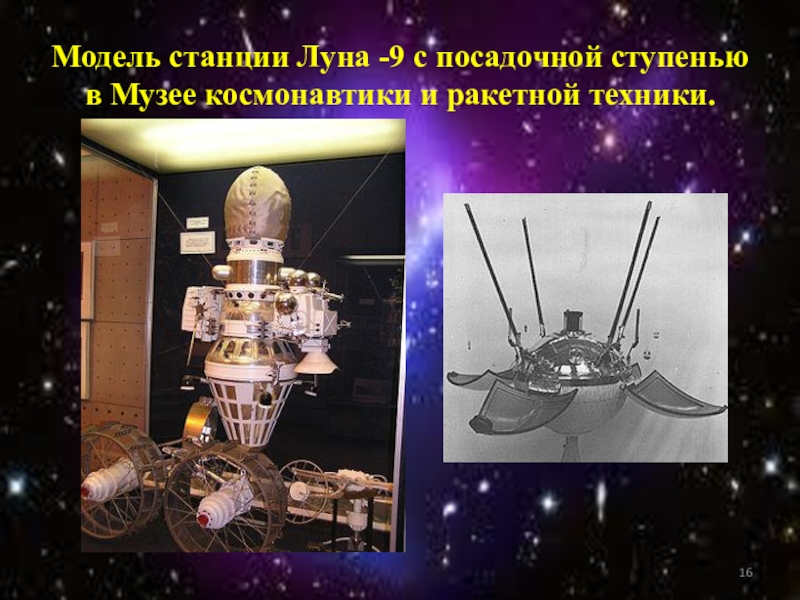 Слайд 16Модель станции Луна -9 с посадочной ступенью в Музее космонавтики и