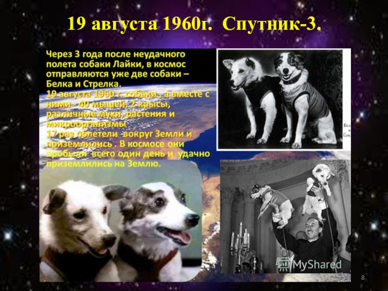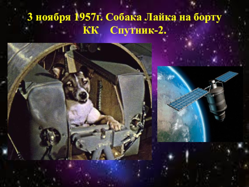 3 ноября 1957г. Собака Лайка на борту  КК  Спутник-2.