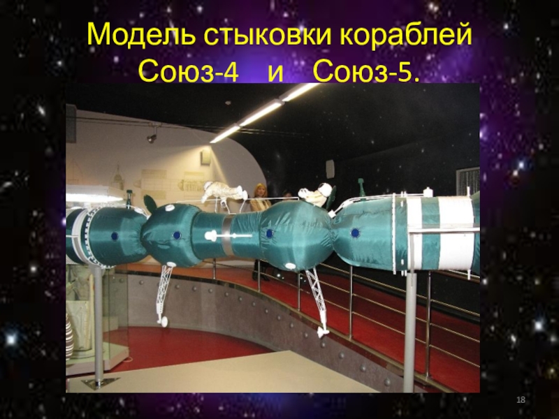 Слайд 18Модель стыковки кораблей Союз-4 и Союз-5.