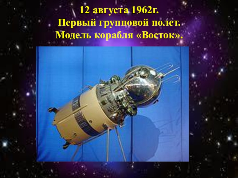 Слайд 1312 августа 1962г. Первый групповой полет. Модель корабля «Восток».