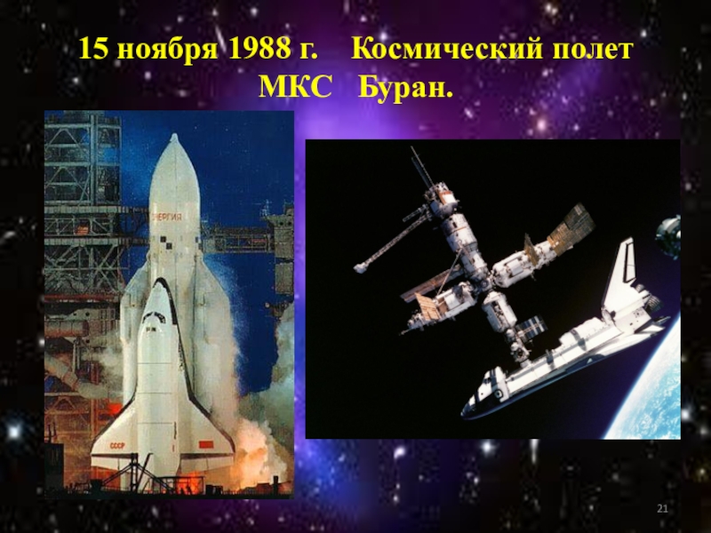 Слайд 2115 ноября 1988 г. Космический полет МКС Буран.