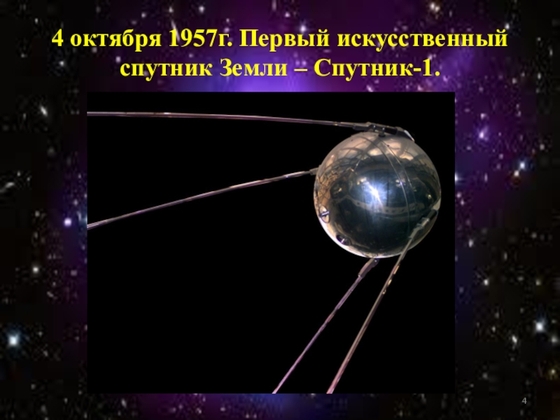 Слайд 44 октября 1957г. Первый искусственный спутник Земли – Спутник-1.