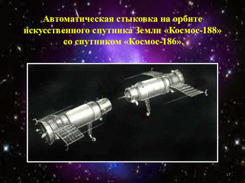 Слайд 17Автоматическая стыковка на орбите искусственного спутника Земли «Космос-188» со спутником «Космос-186».