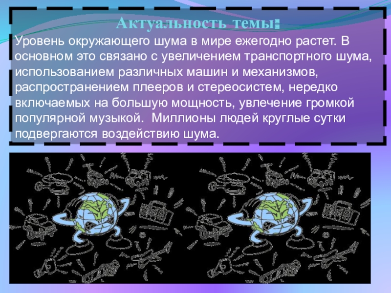 Источником шумового загрязнения может быть промышленное предприятие или транспорт. Шум влияет на нервную систему человека, и потому в городах и на предприятиях проводятся мероприятия по шумозащите.