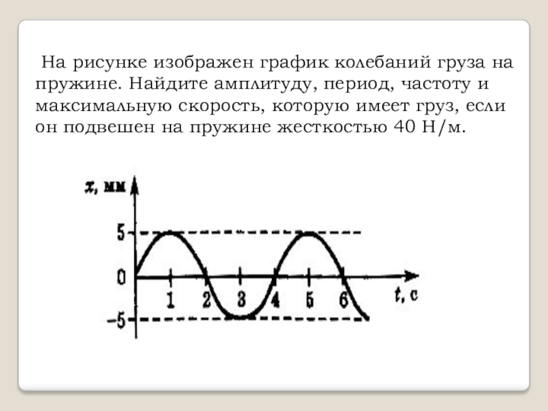 Слайд 4 На рисунке изображен график колебаний груза на пружине. Найдите амплитуду, период,
