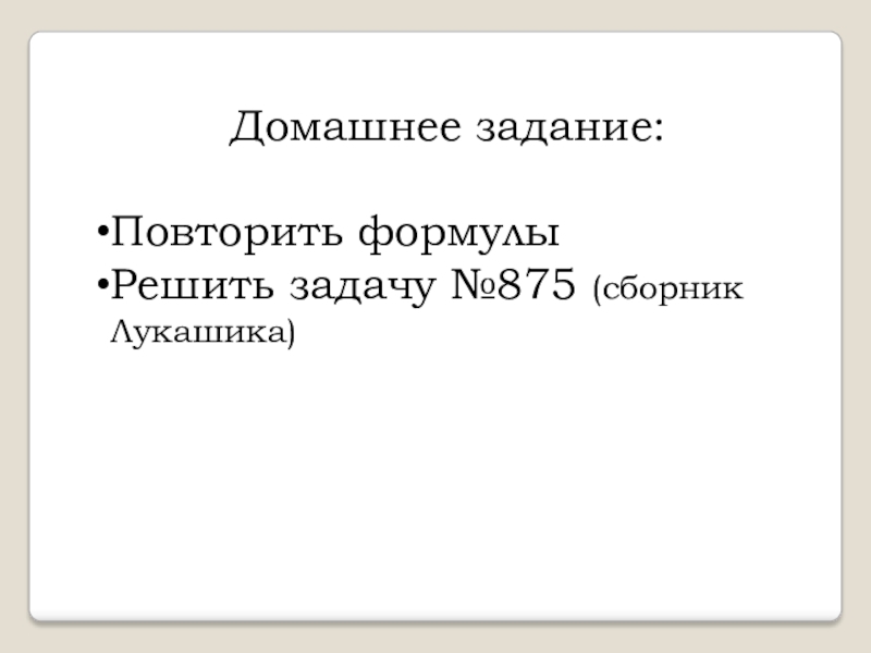 Домашнее задание:Повторить формулыРешить задачу №875 (сборник Лукашика)