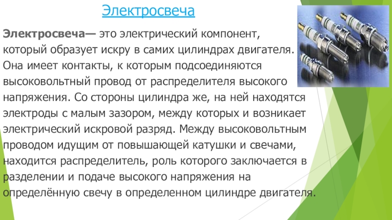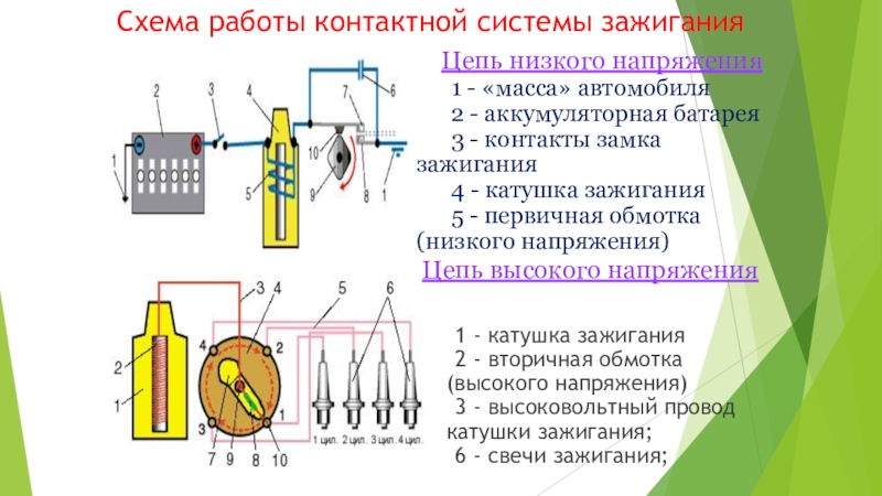 имеет контакты, к которым подсоединяются высоковольтный провод от распределителя высокого напряжения. Со стороны цилиндра же, на ней находятся электроды с малым зазором, между которых и возникает электрический искровой разряд. Между высоковольтным проводом идущим от повышающей катушки и свечами, находится распределитель, роль которого заключается в разделении и подаче высокого напряжения на определённую свечу в определенном цилиндре двигателя.