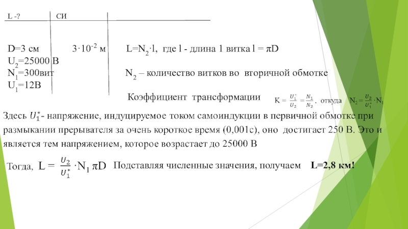 D=3 см 3·10-2 м L=N2·l, где l - длина 1 витка l = πD