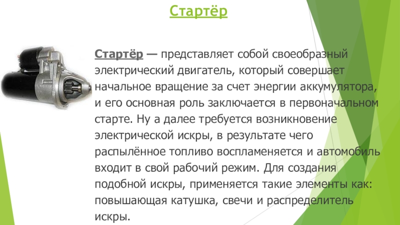 Стартёр — представляет собой своеобразный электрический двигатель, который совершает начальное вращение за счет