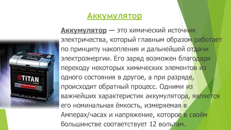 Аккумулятор — это химический источник электричества, который главным образом работает по принципу накопления