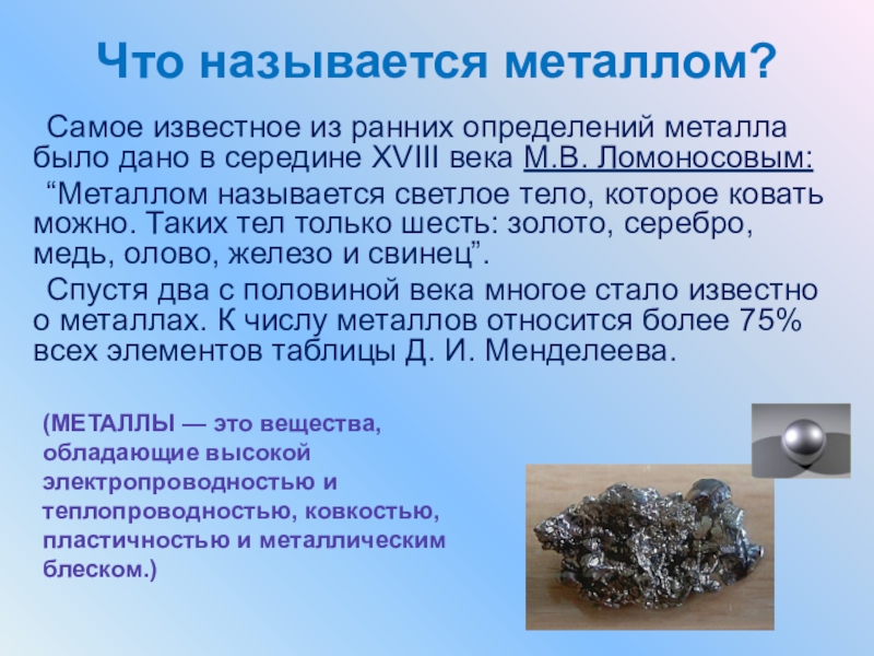 (МЕТАЛЛЫ — это вещества, обладающие высокой электропроводностью и теплопроводностью, ковкостью, пластичностью и металлическим блеском.)