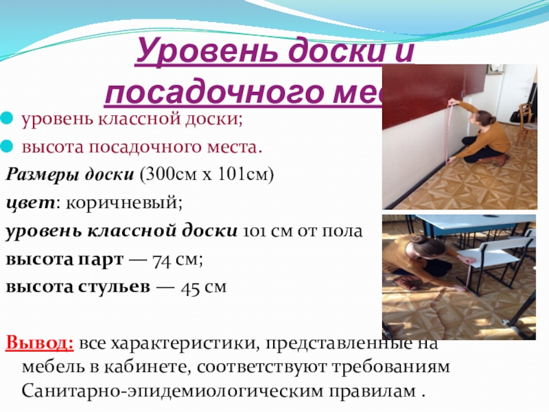 Вывод: все характеристики, представленные на мебель в кабинете, соответствуют требованиям Санитарно-эпидемиологическим правилам .