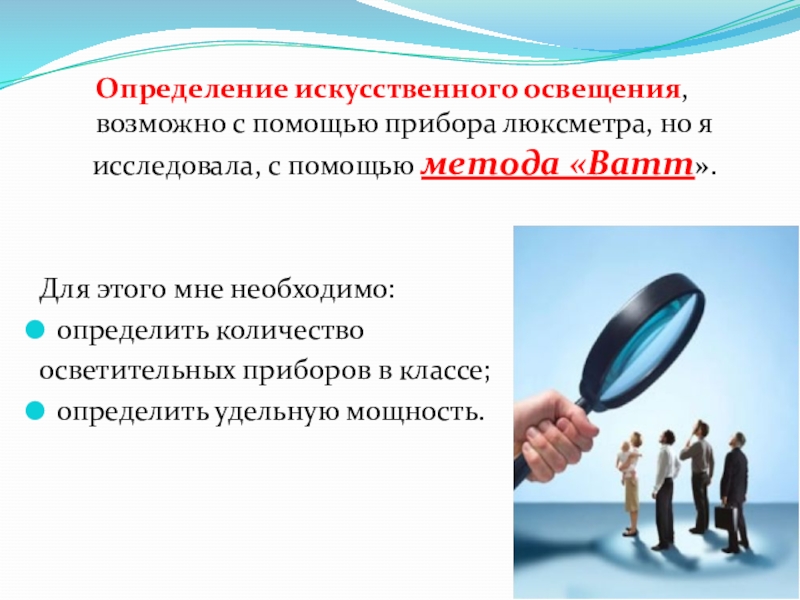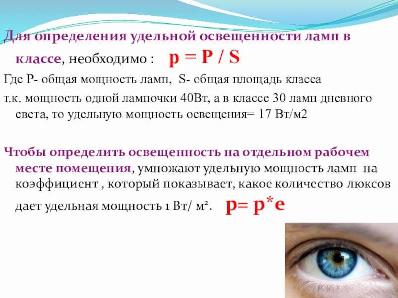 Слайд 20Для определения удельной освещенности ламп в классе, необходимо : р