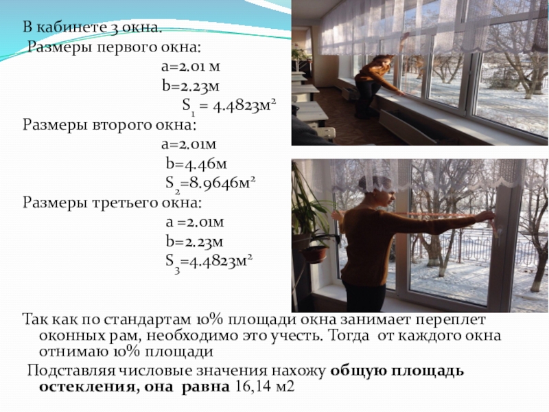 Так как по стандартам 10% площади окна занимает переплет оконных рам, необходимо это учесть. Тогда от каждого окна отнимаю 10% площади