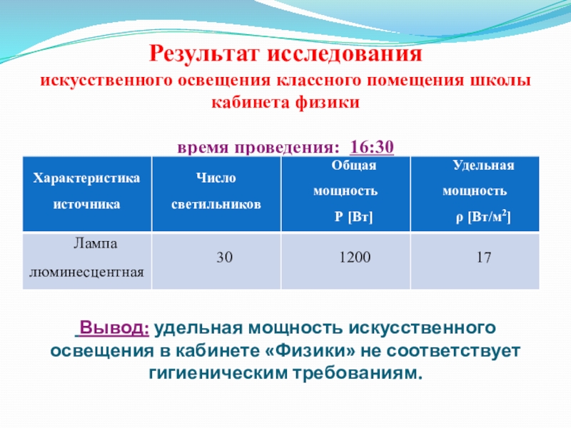 удельная мощность искусственного освещения в кабинете «Физики» не соответствует гигиеническим требованиям.