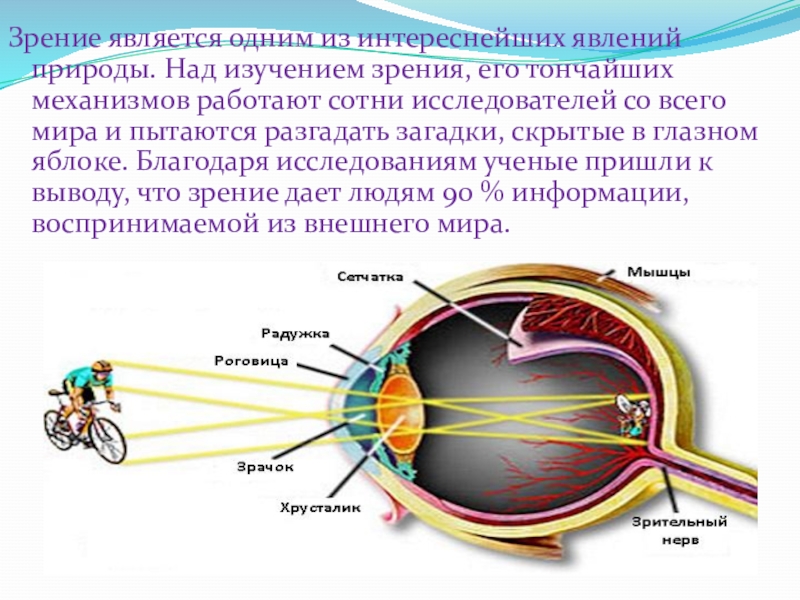 тончайших механизмов работают сотни исследователей со всего мира и пытаются разгадать загадки, скрытые в глазном яблоке. Благодаря исследованиям ученые пришли к выводу, что зрение дает людям 90 % информации, воспринимаемой из внешнего мира.